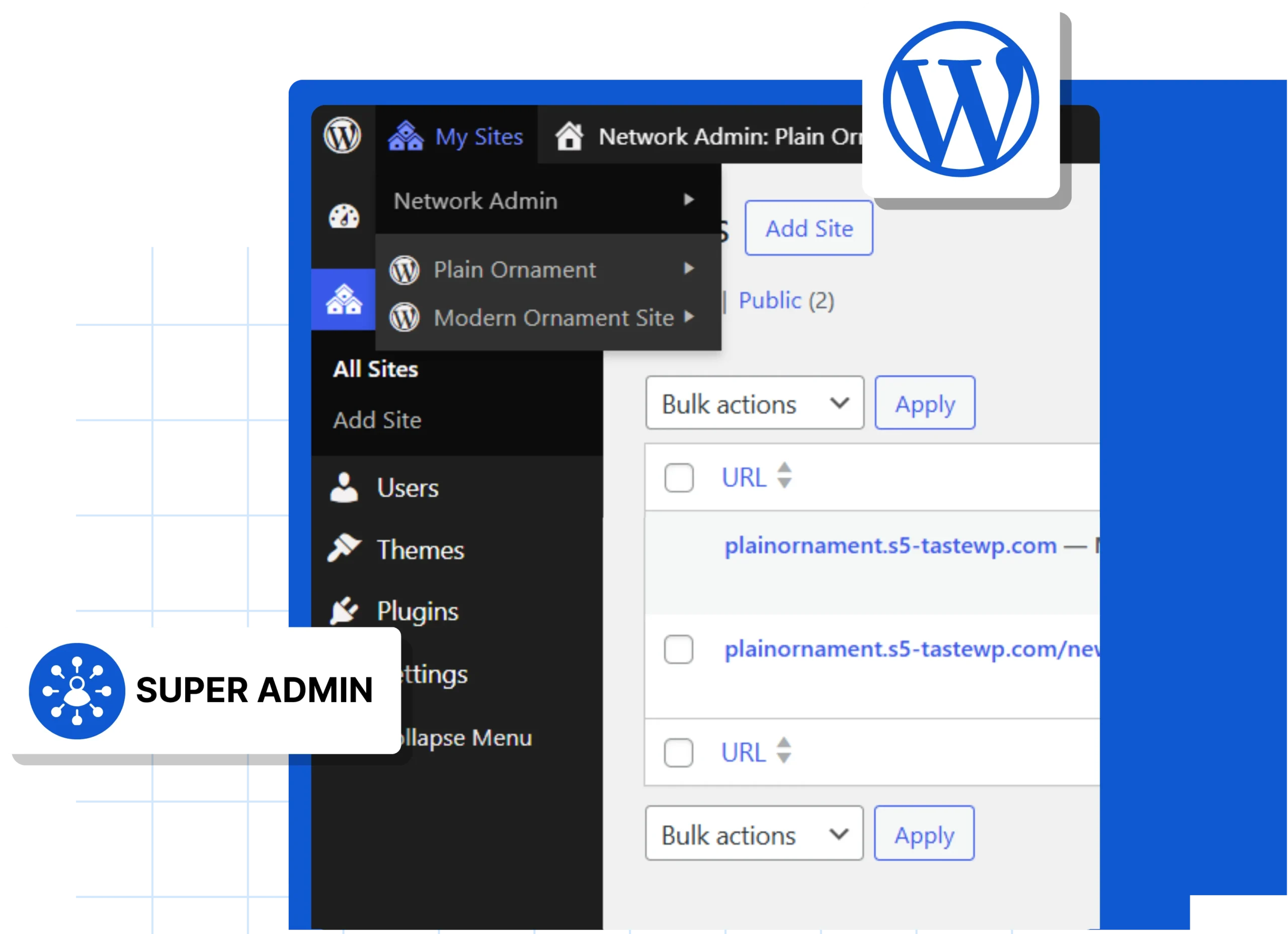 The Super Admin has full control over network-wide settings, themes, plugins, and all subsites. Site Admins manage content and settings only for their assigned sites. Roles and permissions can be configured to match your organizational hierarchy.